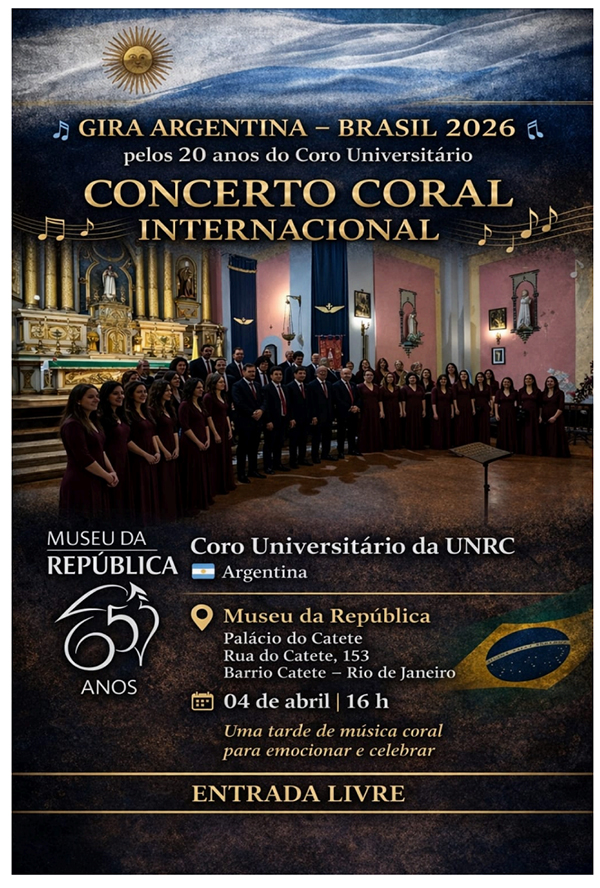 4/4 | Gira Argentina – Brasil 2026. Concerto Coral Internacional. Coro Universitário da Universidade Nacional de Río Cuarto, na Argentina. Apresentação no jardim do museu, a partir de 16h.