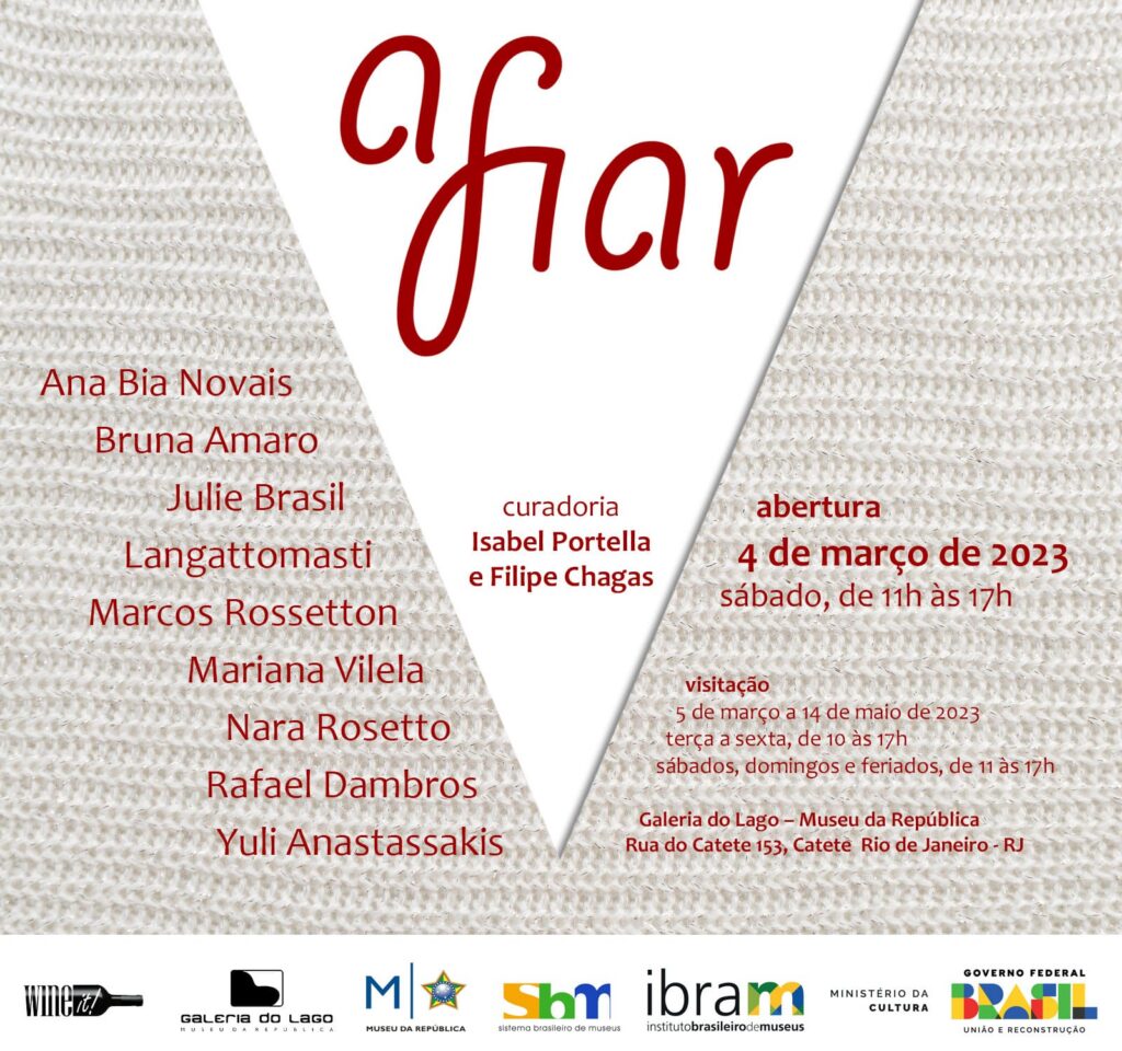 Artistas: Bruna Amaro, Langattomasti, Rafael Dambros, Nara Rosetto, Julie Brasil, Ana Bia Novais, Marcos Rossetton, Mariana Vilela, Yuli Anastassakis. Curadoria: Isabel Portella e Filipe Chagas. Período: 04/03- 14/05/2023.