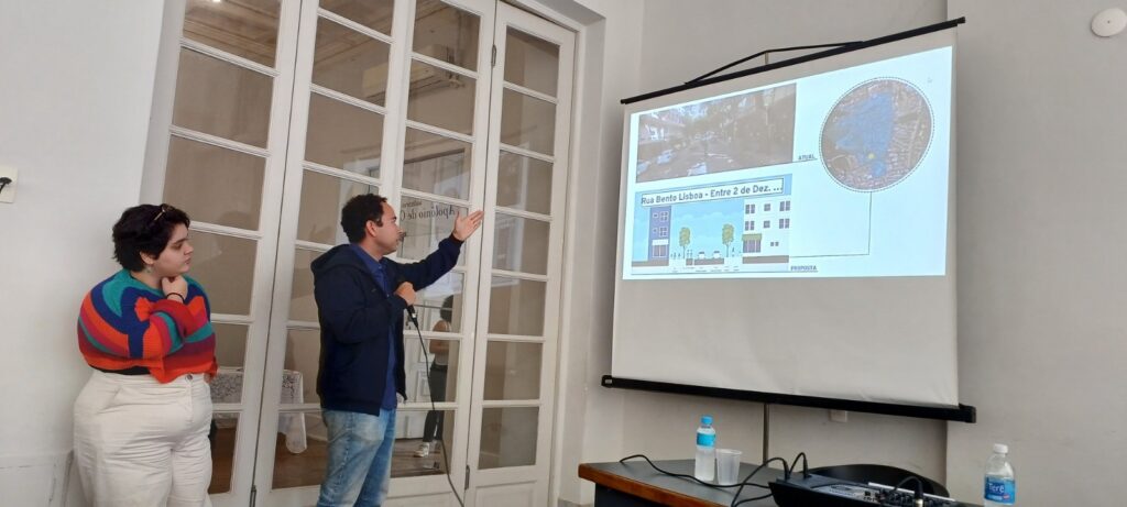 A primeira mesa, “Ordens e Desordens do Catete”, foi mediada por Carlos Fernando Galvão, do Preserva Catete, e teve início logo após a abertura. O grupo de alunos Beatriz Corbacho, Camila Lopes e Fernando Andrade apresentou o projeto “Mobilidade e Acessibilidade Urbana: bairro do Catete”, desenvolvido no curso “Cidade e Patrimônio”. O trabalho propôs melhorias para a mobilidade do bairro com foco em pedestres e ciclistas, em diálogo com recentes intervenções urbanas implementadas na região. Em seguida, os alunos Bernardo Fernandino, Clara Pinheiro, Diogo Maimone, Matias Rosa e Paulo Brant apresentaram o “Estudo Preliminar de Intervenção Urbana no Catete”, com propostas voltadas aos trabalhadores do comércio de rua, como criação de depósitos, áreas de sombra e expositores móveis.