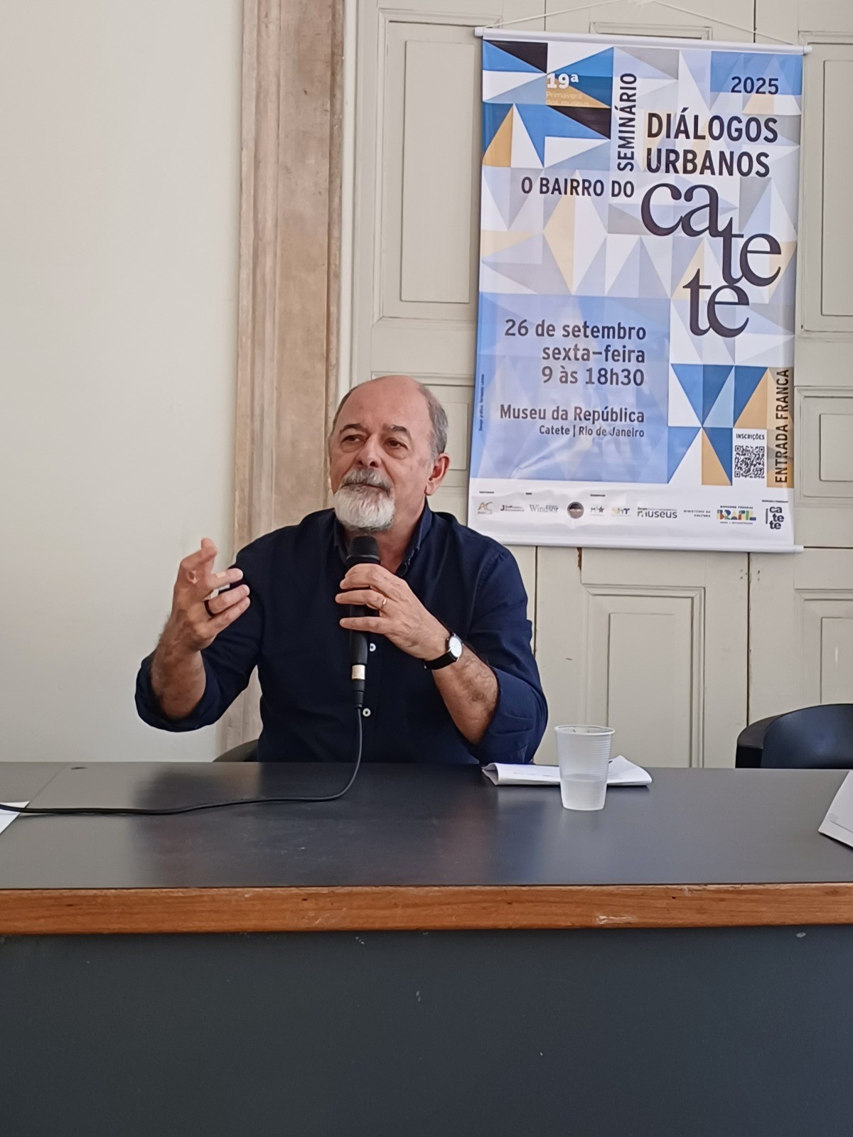 Martha Niklaus, do Preserva Catete, e Moema Branquinho, mosaicista e educadora, apresentaram o projeto “Mural Cultural: Pedras e Histórias – Rua Tavares Bastos”, uma intervenção artística que visa resgatar a memória local e revitalizar a área, promovendo o orgulho comunitário. Por fim, Helton Lourenço, idealizador do projeto “Favela-República”, e André Angulo, museólogo do Museu da República, abordaram o turismo de base comunitária desenvolvido na Tavares Bastos e no Catete, destacando a capacitação de moradores para atuarem como guias e agentes culturais, fortalecendo o vínculo entre história local e desenvolvimento social. O seminário foi encerrado com um debate entre os participantes e o público presente.