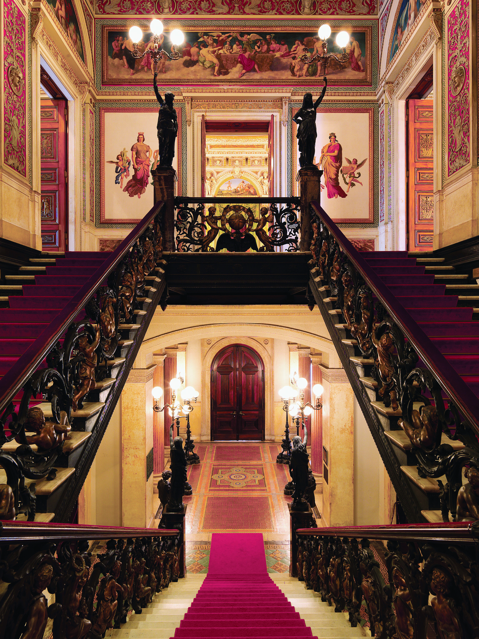 Logo que se inicia a subida do primeiro para o segundo andar, os visitantes veem o Hall da Escada, decorado com motivos que homenageiam as artes: a pintura, o desenho, a arquitetura e a escultura. Cenas mitológicas que copiam os afrescos pintados pelo renascentista italiano Rafael (1483-1520) na Villa Farnesiana completam a decoração que tem ainda visão central de uma cópia em metal da escultura Afrodite de Cápua, que está no Museu Nacional de Nápoles.